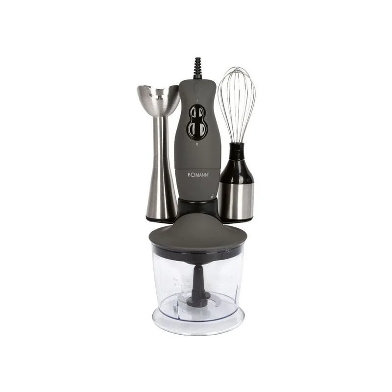 Универсальный блендер 3 в 1 SMS 6055 CB от Bomann, включая двигатель на 400 Вт, вы получаете ручной блендер, мульти-шредер и венчик - объединены в одно устройство. Ручной блендер просто идеально обрабатывает всё - будь то бананы, перец, морковь или грецкие орехи. В зависимости от желаемой консистенции или ингредиентов, подлежащих обработке, вы можете выбрать один из двух скоростей. Благодаря эргономичной и прорезиненной ручке, оптимальная управляемость гарантирована.