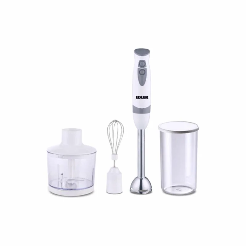Погружной блендер, мощность 700 Вт, 2 скорости, погружная часть металлическая, ножи из нерж. стали, измельчитель – 0.5 л, мерный стакан – 0.6 л, венчик для взбивания, корпус из пластика.