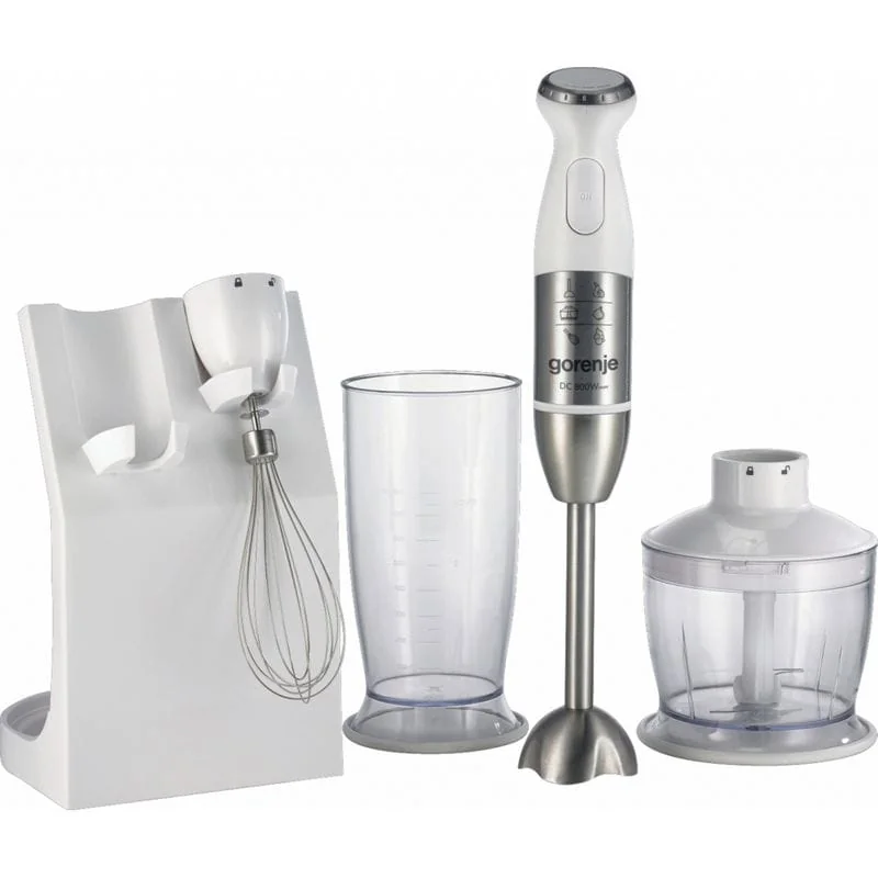 Расширенная комплектация блендера Gorenje HBC806QW включает в себя непосредственно блендер с металлической ногой, мерный стакан, мини-измельчитель с чашей, насадку для взбивания (венчик), а также оригинальную подставку, на которой можно хранить аксессуары.