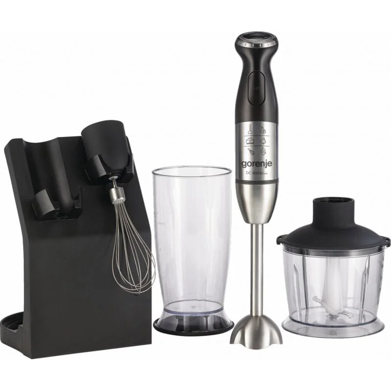 Расширенная комплектация блендера Gorenje HBC807QB включает в себя непосредственно блендер с металлической ногой, мерный стакан, мини-измельчитель с чашей, насадку для взбивания (венчик), а также оригинальную подставку, на которой можно хранить аксессуары.
