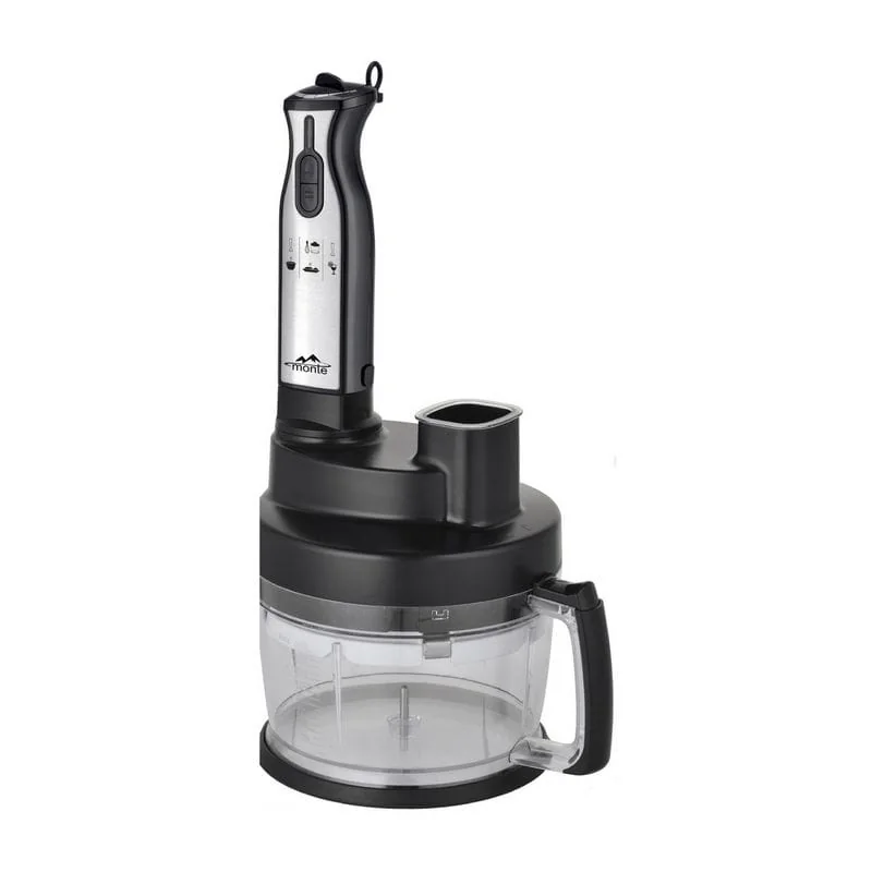 В комплектацию блендера Monte MT-1910 входит измельчитель. Он представляет собой емкость для обработки ингредиентов. Конструкция этой чаши позволяет работать с продуктами, которые не разбрызгиваются вокруг. Удобная крышка имеет отверстия для погружения ручной части устройства. Изготовлен измельчитель из пластика, он имеет емкость 1,75 л.