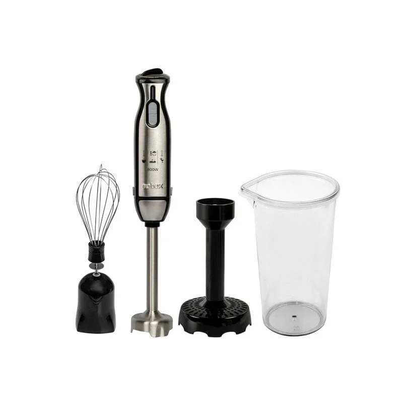 Питание - 220-240В, 50Гц, Мощность 800 Вт. 2 скоростных режима работы. Регулятор скорости на корпусе. Ножи четырехлепестковые из нержавеющей стали. Пластиковый корпус со съемной ногой. Нога из нержавеющей стали. Подвесная петля. Аксессуары: мерный стакан 0,6 л, венчик из нержавеющей стали, насадка для пюре.