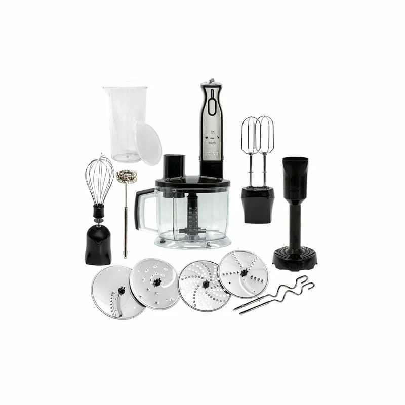Питание - 220-240В, 50Гц, Мощность 800 W. 2 скоростных режима работы. Регулятор скорости на корпусе. Ножи четырехлепестковые из нержавеющей стали. Пластиковый корпус со съемной ногой. Нога из нержавеющей стали. Подвесная петля. Аксессуары: чаша с измельчителем 1,75 л, мерный стакан 0,6 л, Венчик из нержавеющей стали, Диск-терка для дерунов, Диск двусторонний для грубой нарезки и измельчения овощей и фруктов, Диск двусторонний для мелкой нарезки и измельчения овощей и фруктов, Диск для нарезки соломкой, насадка для пюре, Насадка-миксер, Насадка для замеса, Вспениватель молока.
