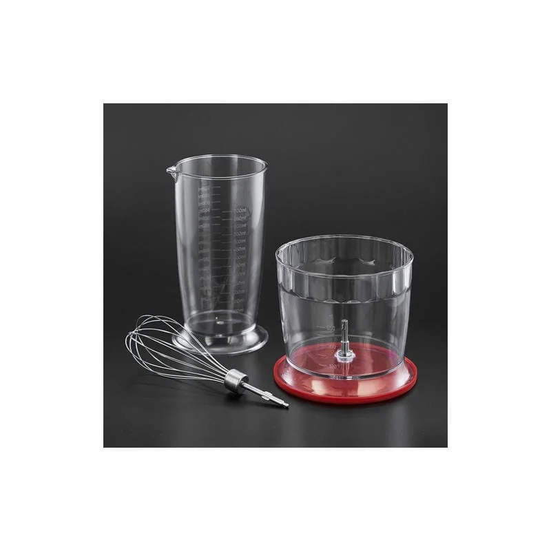 - В комплекте: мерный стакан емкостью 0.5 литра, измельчитель емкостью 0.5 литра с ножами из нержавеющей стали, венчик из нержавеющей стали.