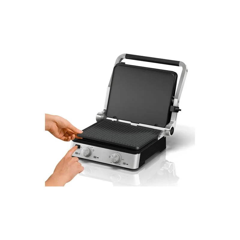 Хотя гриль один, он может готовить одновременно два блюда двумя разными способами. Отрегулируйте температуру для каждой пластины по своему усмотрению, чтобы получить уникальный результат. Так, например, можно сильно прожарить нижнюю половину горячего бутерброда, лишь разогрев верхнюю, чтобы начинка, расположенная на ней, не утратила изначальных вкусовых качеств. Максимально точное поддержание температуры (60-230 град.) гарантирует электроника. Потребляемая мощность не превышает 2000 Вт., что можно считать довольно экономичным показателем.