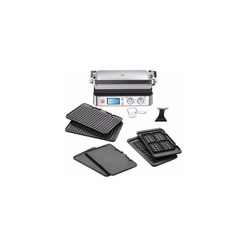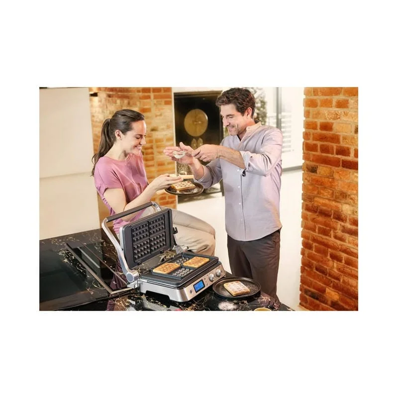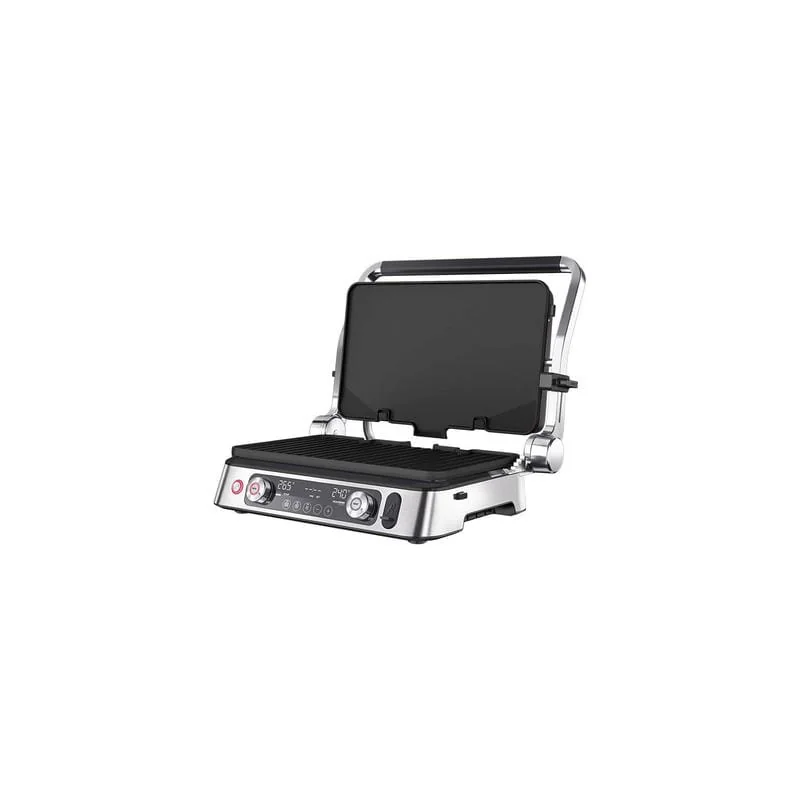 Мощность: 2000 Вт. Три режима приготовления. 2 пластины гриль. 2 пластины плоские. 2 пластины для приготовления венских вафель. Два регулируемых термостата (отдельные для верхней и нижней пластин). Температура нагрева пластин: от 60°C до 230°C. Функция Sear (на несколько минут увеличивает мощность, разогревая пластины до 250°C, чтобы образовалась насыщенная коричневая корочка-гриль). ЖК-дисплей. Лопатка-скребок. Мерный стакан-дозатор для вафель. Мобильное приложение.