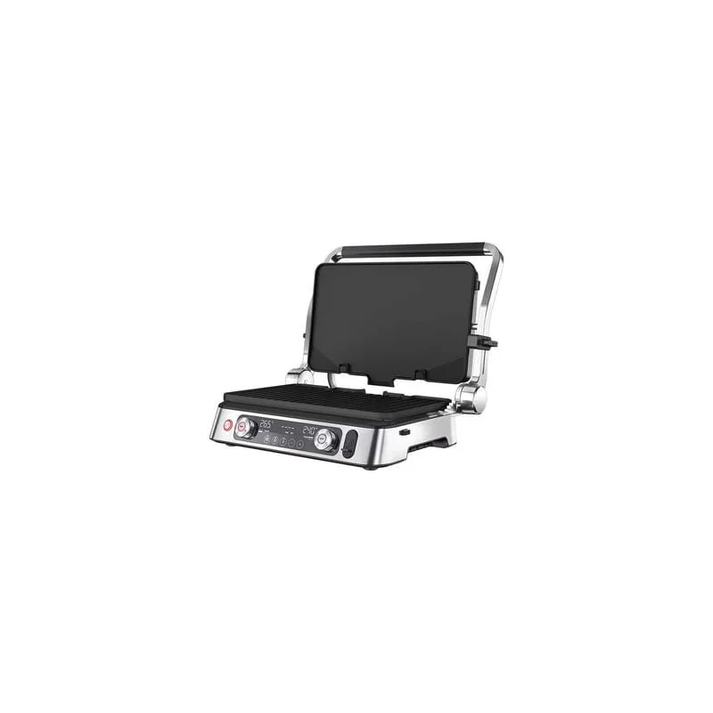 Электрогриль имеет 2 раскладные пластины, которые можно использовать разными способами. Во-первых, как единое пространство для приготовления большого количества порций мяса или овощей; во-вторых, обжаривая разные продукты на двух половинах одновременно, причем с разной температурой, так как прибор оснащен двумя раздельными термостатами и может разогреваться от 60 до 260 градусов. Дополнительный режим работы «Sear» позволяет быстро получить аппетитную хрустящую корочку на мясе. Также прибор оснащен полезным приспособлением для точного определения температуры мяса – термозондом. Теперь вы сможете готовить идеально! В комплект поставки входит лопатка-скребок, а также 1 плоская и одна ребристая пластина.