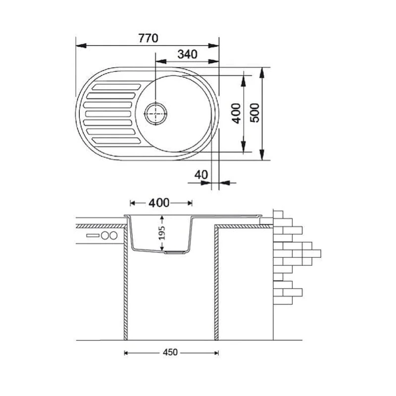 - Размер мойки: 770*500 мм. - Диаметр чаши: 400 мм. - Глубина чаши: 195 мм. - Вырез для установки: по шаблону - Оборачиваемая в две стороны - Сифон с клапаном и отстойником - Перелив в чаше - Композитный материал: 75% гранита - Ширина шкафа (мин.): 450 мм.