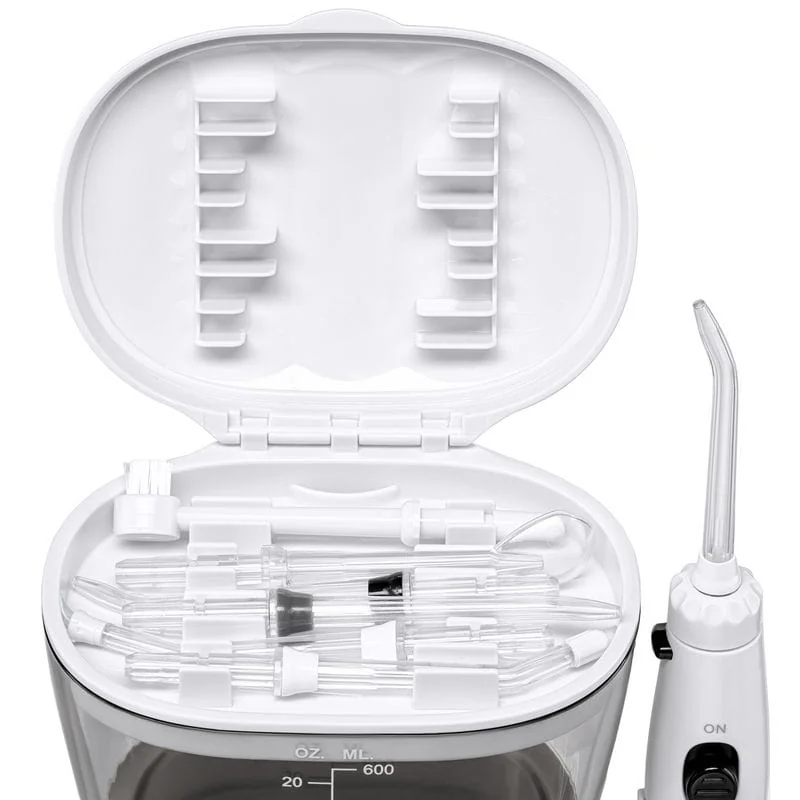 Десять режимов и резервуар на 600 мл позволяют выбрать оптимальный уровень давления и подачи воды для каждой насадки и качественной очистки ротовой полости.