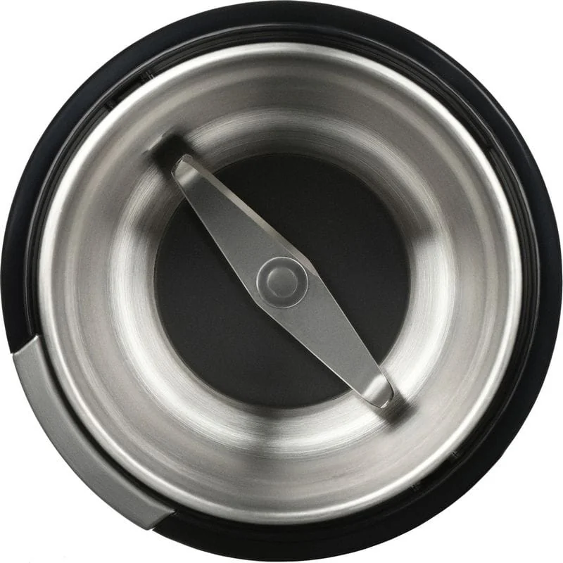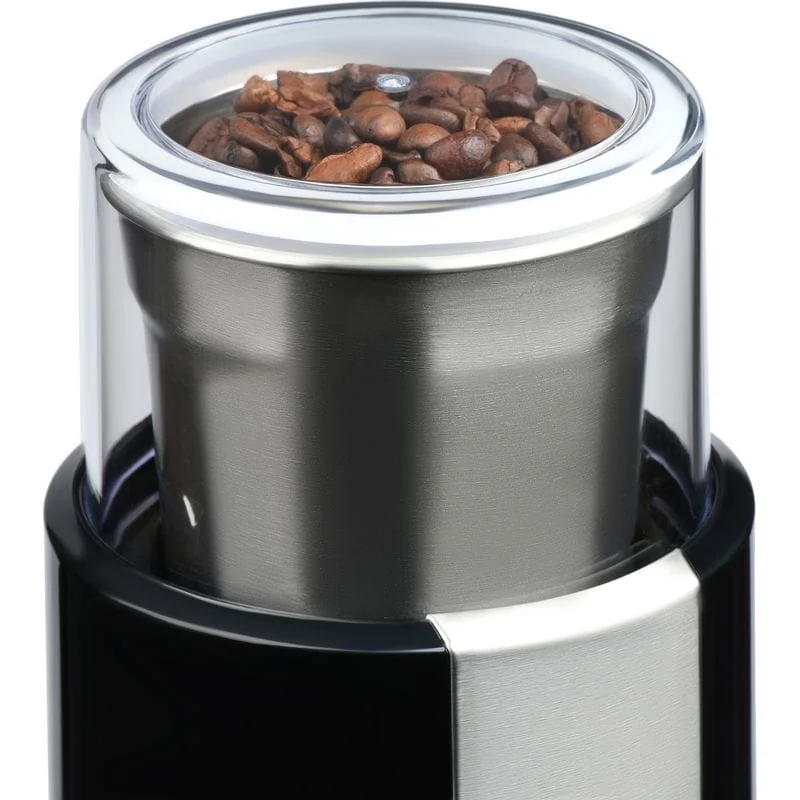 Премиальный дизайн. Корпус кофемолки выполнен из прочного матового черного пластика и вставок из шлифованного металла. Прозрачная крышка с прорезиненным уплотнителем позволяет контролировать процесс работы, а съемный стальной контейнер на 60 г – простой доступ к измельченным продуктам и легкую очистку.