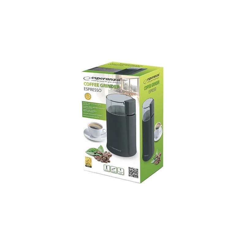 Ее современный и эргономичный дизайн и небольшой размер подойдет для любой кухни. Кофемолка Esperanza EKC001K Espresso изготовлена из прочных и износоустойчивых материалов. Корпус – эко-пластик. Пластиковая прозрачная крышка поможет комфортно наблюдать за процессом помола.