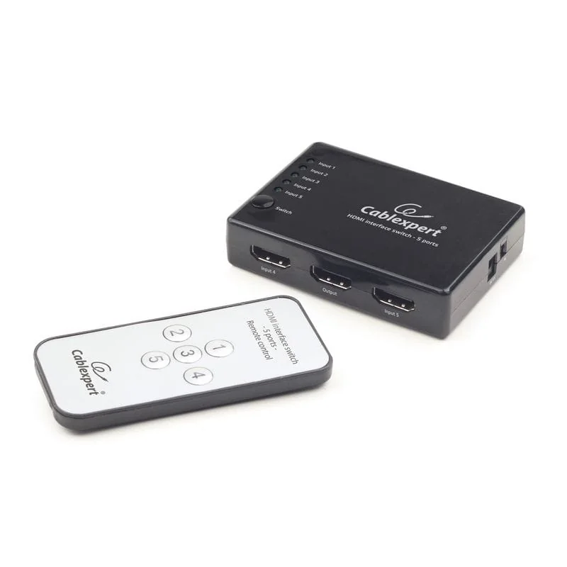 коммутатора видео Cablexpert HDMI V.1.4a (5 вх, 1 вых) : позволяет использовать один телевизор с 5 HDMI источниками; не требуется программное обеспечение; идеальное цифровое видео и высокое качество 3D телевидения и звука; может также использоваться как 25 метровый HDMI удлинитель; переключает до 5-х цифровых HDMI видео\аудио сигналов на 1 монитор, телевизор или плазменный экран; цифровой широкополосный 2.55 ГГц усилитель увеличивает дальность распространения сигнала до 25 метров, восстанавливая качество входного сигнала; инфракрасный пульт дистанционного управления.