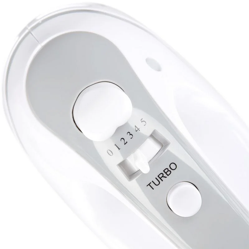 Для взбивания продуктов в комплект входят 2 сбивальных насадки-венчик и 2 насадки для приготовления теста. На корпусе расположен удобный переключатель режимов.