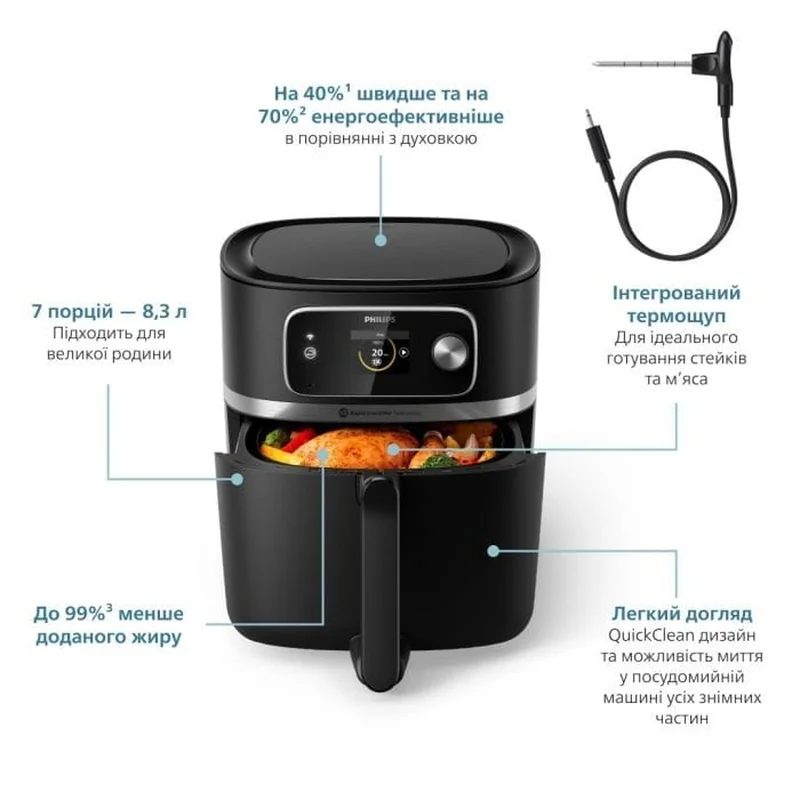 Интуитивный дисплей для удобной работы с устройствомСтильный дизайн и интуитивный дисплей: аэрогриль впишется в интерьер кухни, а вы легко разберетесь, как использовать устройство.