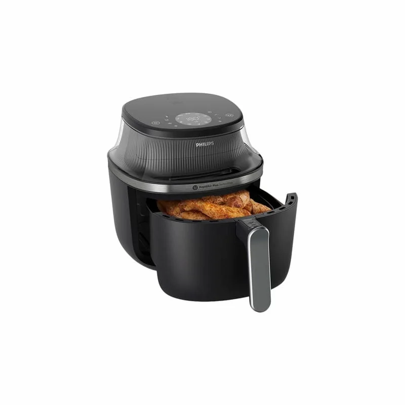 Наслаждайтесь вкусной едой, которая содержит до 90% меньше жира. Запатентованная технология RapidAir Plus с уникальной конструкцией в форме звезды имеет большую скорость потока, обеспечивая циркуляцию горячего воздуха вокруг и сквозь блюдо, благодаря чему оно готовится равномерно внутри и снаружи, а вы получаете вкусное домашнее блюдо.