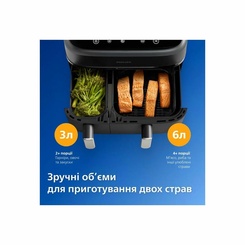 Автоматически синхронизируйте приготовление в 2 корзинах, чтобы вы могли подать все блюда горячими на стол одновременно. Завтрак, обед или ужин – еда свежая и горячая каждый раз.