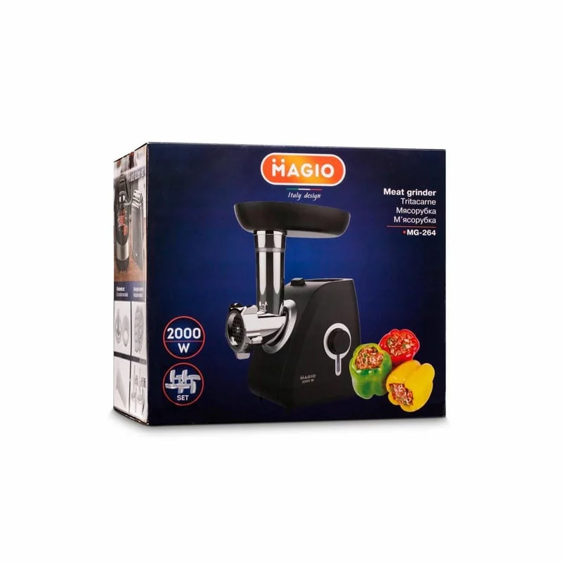 Magio — бренд бытовой техники для дома, который за несколько лет на рынке Украины зарекомендовал себя как надежный производитель техники. Мощная мясорубка Magio MG-264 в 2000 Вт поможет Вам быстро и с легкостью измельчить мясо, рыбу и овощи. Два режима работы помогут справиться даже с жёстким мясом и жилками. Также в комплекте с мясорубкой идут два ножа из нержавеющей стали, которые прослужат Вам долго. Загрузочная платформа позволит с большим удобством обеспечить подачу исходного продукта. При этом маленькие кусочки не будут падать мимо. С помощью насадки для колбасок Вы сможете легко приготовить домашние колбаски, сосиски или сардельки: натуральная оболочка крепится на эту насадку, насадка – на шнек, и Вам остается только контролировать процесс наполнения будущей колбаски фаршем. А насадка «кеббе» поможет Вам получить полые трубочки для наполнения их фаршем и последующего обжаривания. Функция «Реверс» поможет справиться с застрявшими кусочками продукта и Вам не придётся вручную разбирать прибор и извлекать то, что мешает его работе.
