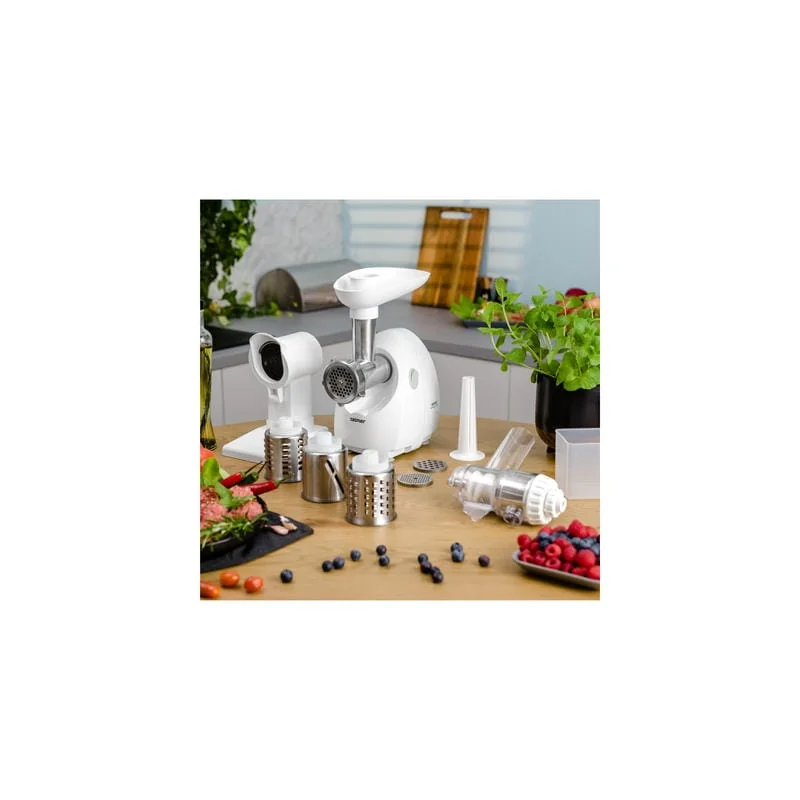 Электрическая мясорубка Zelmer ZMM4050B заказать в интернет-магазине. Вы точно останетесь довольны приобретением, так как модель обладает достаточно высокой мощностью – 1900 Вт, что позволяет переработать достаточно большой объем продуктов и получить за 1 минуту работы до 2,5 килограмм фарша. Модель имеет очень большую комплектацию дополнительными насадками. Кроме стандартных решеток в количестве 3 штук с разным диаметром отверстий, в наборе насадка для колбас, шинковка с 4 терками разного типа нарезки, и соковыжималка для томатов и мягких овощей и фруктов.