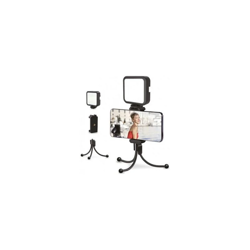 Комплект блогера Piko Vlogging Kit PVK-02L состоящий из 5" настольного гибкого трипода с держателем для смартфона. Чувствителдьность 20 дБ. LED подсветка белого света (36 точек LED, 650K, >600Lux). Питание от АА батареек. Кнопка дистанционного управления смартфоном Bluetooth.