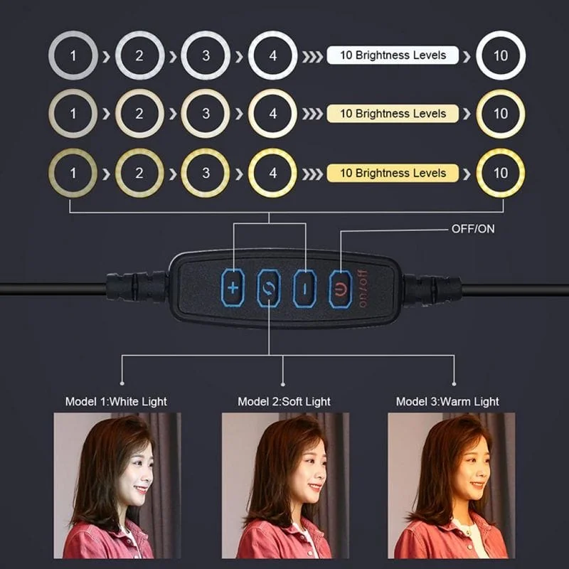 Комплектация кольцевая LED лампа, держатель телефона, штатив-трипод