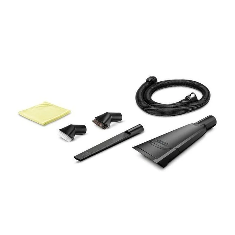 Набор Karcher для уборки в автомобіле - 6 единиц, 0.725 кг 2.863-304.0. Благодаря большому набору аксессуаров, состоящему из 1,5-метрового удлинительного шланга, удлиненной щелевой насадки, автомобильной насадки, всасывающей щетки с жесткой щетиной, всасывающей щетки с мягкой щетиной и салфетки из микроволокна для гладких поверхностей и поверхностей окон. как детская игра – и машина становится безупречно чистой зоной хорошего самочувствия.