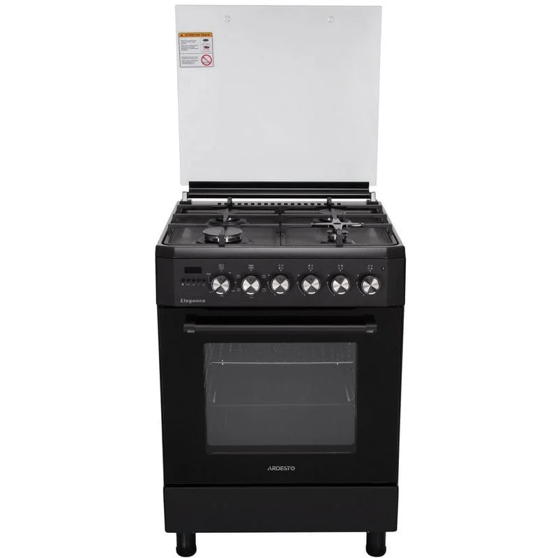Комбинированная плита ARDESTO Elegance – это удачный дуэт газовой варочной поверхности с электрическим духовым шкафом. Общая мощность четырех газовых горелок составляет 6,6 кВт, тогда как мощность духового шкафа – 2257 Вт. Для безопасного использования плиты предусмотрен газ-контроль. Газовые форсунки: NG (G20 – 13 мбар). Также в комплекте поставки есть форсунки для сжиженного газа (LPG). Модель выполнена в минималистском черном цвете, затемнена вдоль краев стеклянная дверца духовки в центре имеет почти прозрачное окошко для лучшего обзора. Стильного акцента плите добавляют элементы из нержавеющей стали: поворотные колесики, рукоятка на дверце шкафа и горелки. Зажигание автоматическое – просто нужно нажать на поворотное колесико соответствующей конфорки.