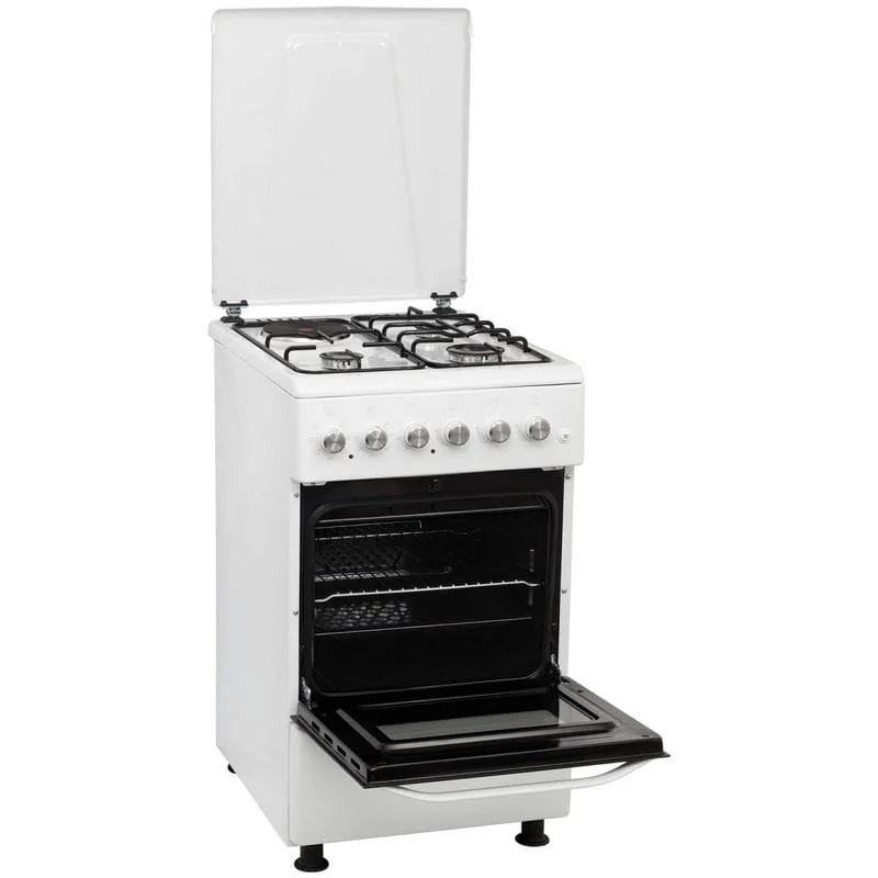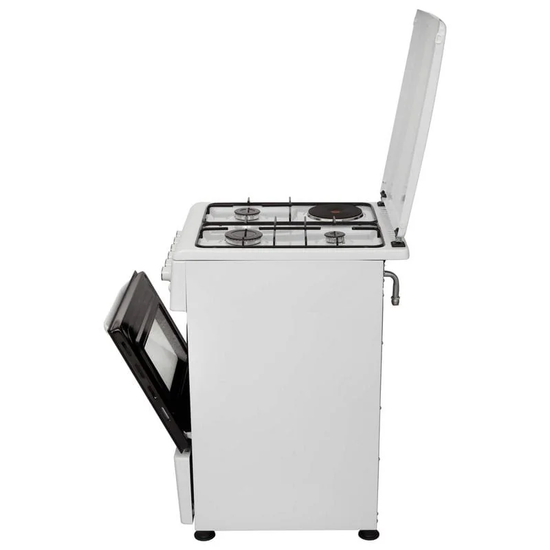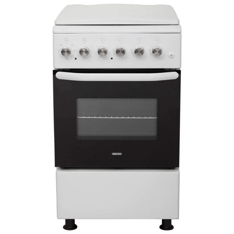 ELEYUS CORUS 5007 H1 – кухонная плита с комбинированной варочной поверхностью и электрическим духовым шкафом объемом 52 л. Имеет защитную металлическую крышку и регулируемые ножки, чтобы изменить высоту плиты и надежно установить ее.