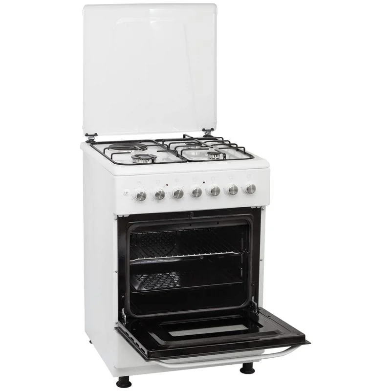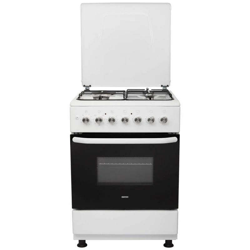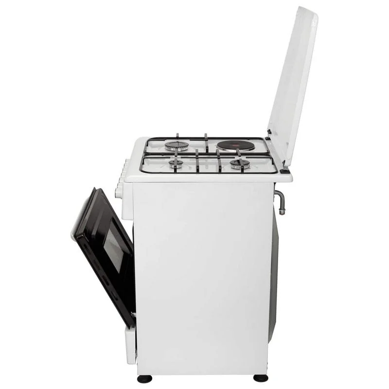 ELEYUS CORUS 6007 H1 – кухонная плита с комбинированной варочной поверхностью и электрическим духовым шкафом объемом 52 л. Имеет защитную металлическую крышку и регулируемые ножки, чтобы изменить высоту плиты и надежно установить ее.