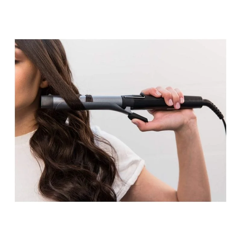 Нагревательный элемент основания изготовлен с титано-керамическим покрытием, которое улучшает скольжение по волосам, и они не травмируются во время завивки. Ручка устройства не нагревается, имеет встроенную подставку и вращается шнур. На ручке размещены переключатели включения и отключения, поворотный регулятор для 9 уровней температуры в диапазоне от 130С до 220С.