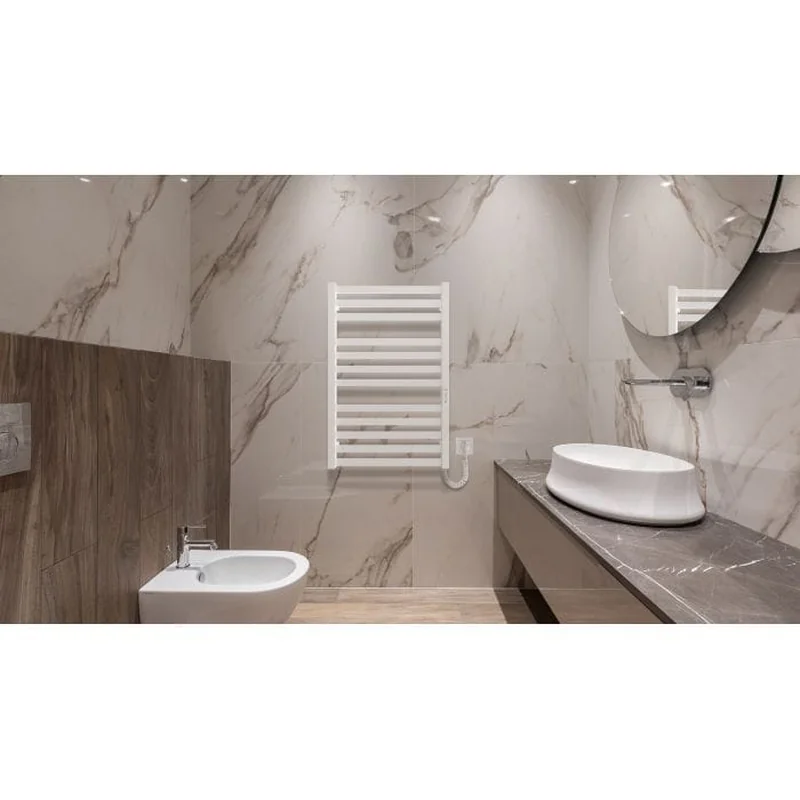 Электрический полотенцесушитель HF Oxford 770х530. Оснащен таймер-регулятором. Включает в себя скрытое подключение. Имеет 12 ребер и стойки из профильной трубы. Варианты обработки: Черный мат, Белый мат. Температурные режимы таймера-регулятора: 40°C, 45°C, 50°C. Варианты времени работы: 3, 6 часов и постоянный нагрев.