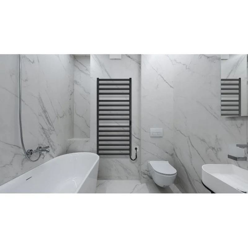 Электрический полотенцесушитель HF Oxford 1170x530. Оснащен таймер-регулятором. Включает в себя скрытое подключение. Имеет 16 ребер и стойки из профильной трубы. Варианты обработки: Черный мат, Белый мат. Температурные режимы таймера-регулятора: 40°C, 45°C, 50°C. Варианты времени работы: 3, 6 часов и постоянный нагрев.