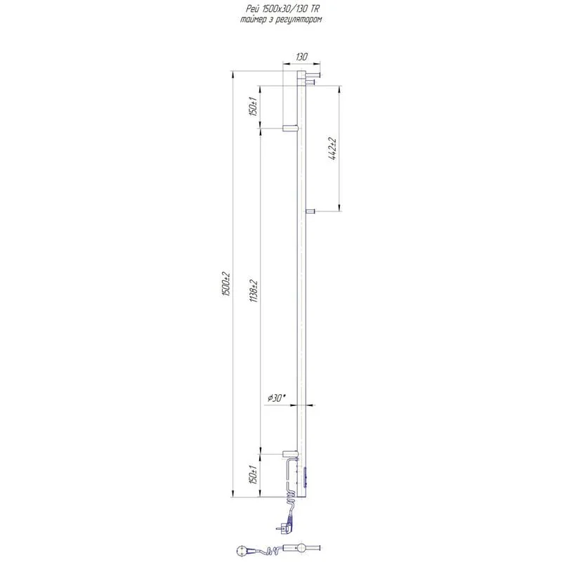 Электросушилка для полотенец бытовая Рей Кубо-І 1500x30/130 TR. Оборудована таймер-регулятором. Совместима с комплектом скрытого подключения. Имеет стояк из квадратного профиля. Изготовлен из полированной нержавеющей стали без хромирования. Варианты покрытия: полированный, сатин, черный мат. Температурные режимы таймер-регулятора: 40°С, 45°С, 50°С. Варианты времени: 3, 6 часов и постоянный нагрев. Мощность 50 Вт. Гарантия – 20 лет на корпус / 5 лет на электрическую часть.