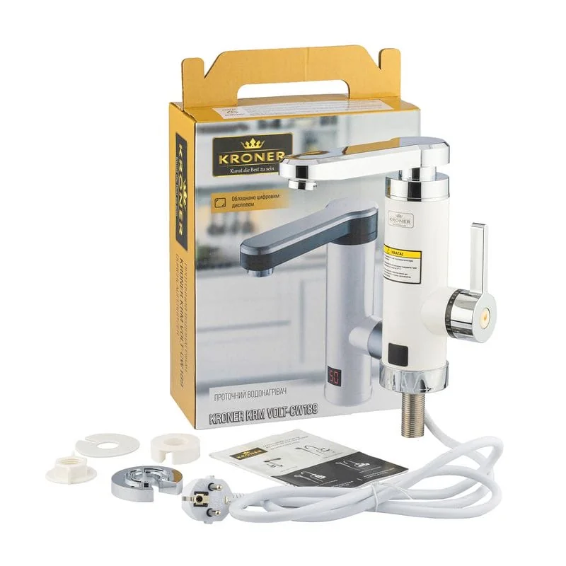 Коллекция кранов с электроподогревом Volt от немецкого производителя Kroner создана специально для помещений, в которых нужна горячая вода, но нет возможности её подвести от центральных магистралей. Фактически модели данной серии являются проточными водонагревателями, которые интегрированы со смесителем. Данные краны помогут даже сэкономить энергию в тех случаях, где тёплая вода нужна не регулярно, так как бойлерные системы требуют постоянного подогрева воды, а данный кран потребляет электричество только когда его включают (например ополоснуть руки или помыть посуду). Также такие краны часто используют на дачах и загородных домиках, так как не нужно сливать воду на зиму.