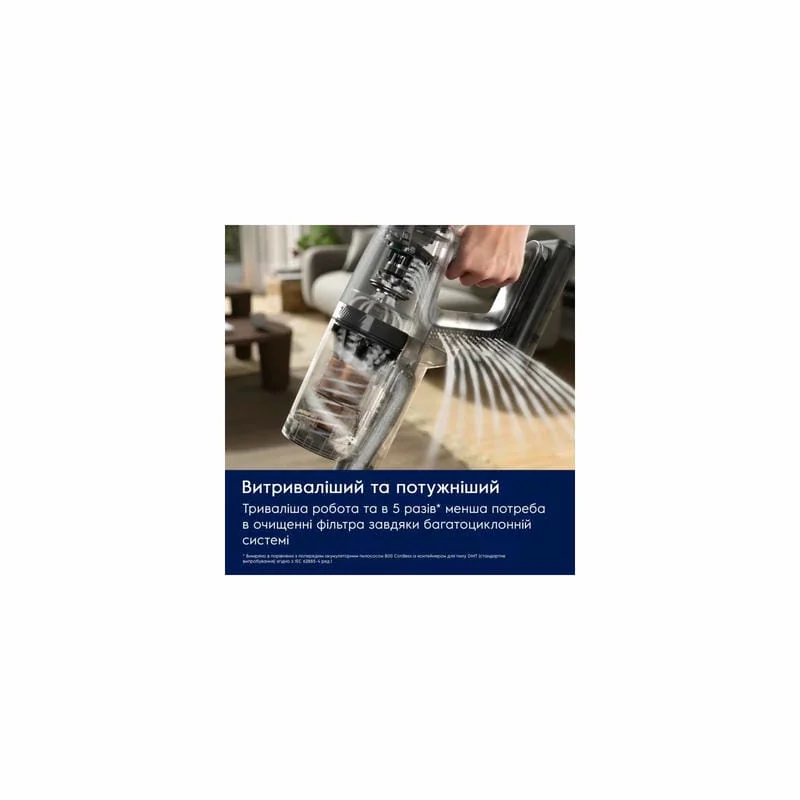 Усовершенствованный циклонический сепаратор обеспечивает высокую длительную мощность всасывания, уменьшая засор фильтра в 5 раз*. Это сводит к минимуму необходимость очищать и заменять фильтр слишком часто.