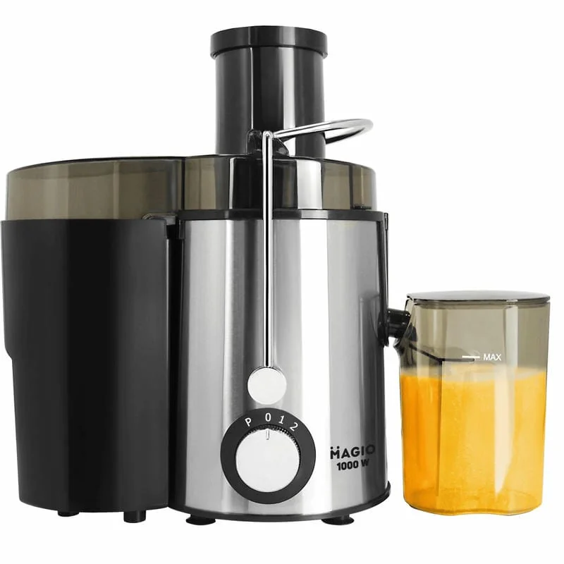 Универсальная соковыжималка Magio MG-187— это сочетание ультрамодного дизайна и высочайшего качества исполнения. Пиковая мощность 1000 Вт, два регулятора скорости, система защиты от перегрева, эффективный отжим сока — все это гарантирует вам отличный результат. А прорезиненные ножки надежно удерживают прибор на поверхности стола. Высокая скорость вращения позволяет получать максимальное количество сока даже из твердых овощей или фруктов.