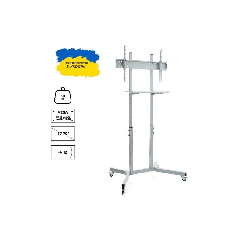 Стойка рассчитана на вес до 50 кг, что гарантирует безопасность и стабильность даже для больших экранов. Благодаря маленьким колесам, установленным на ножках, стойку можно легко перемещать по помещению.