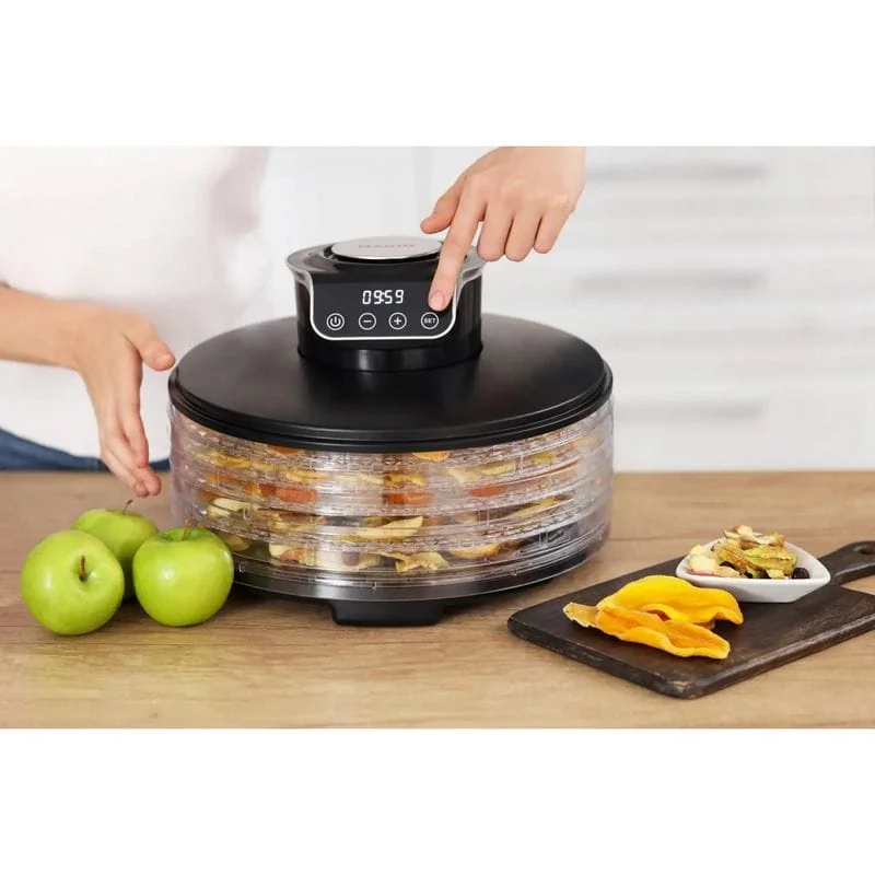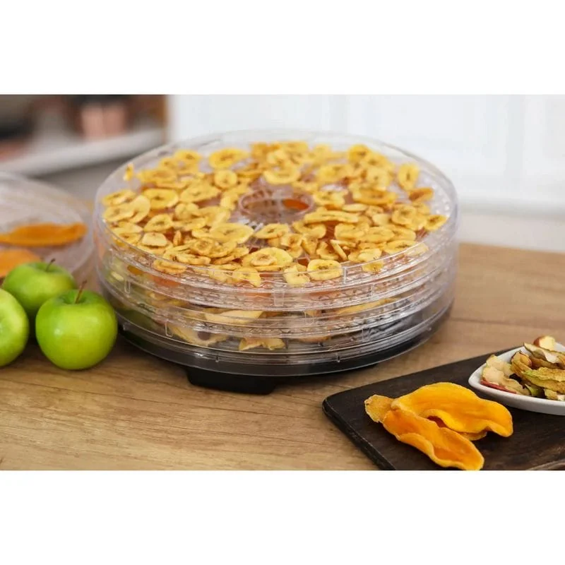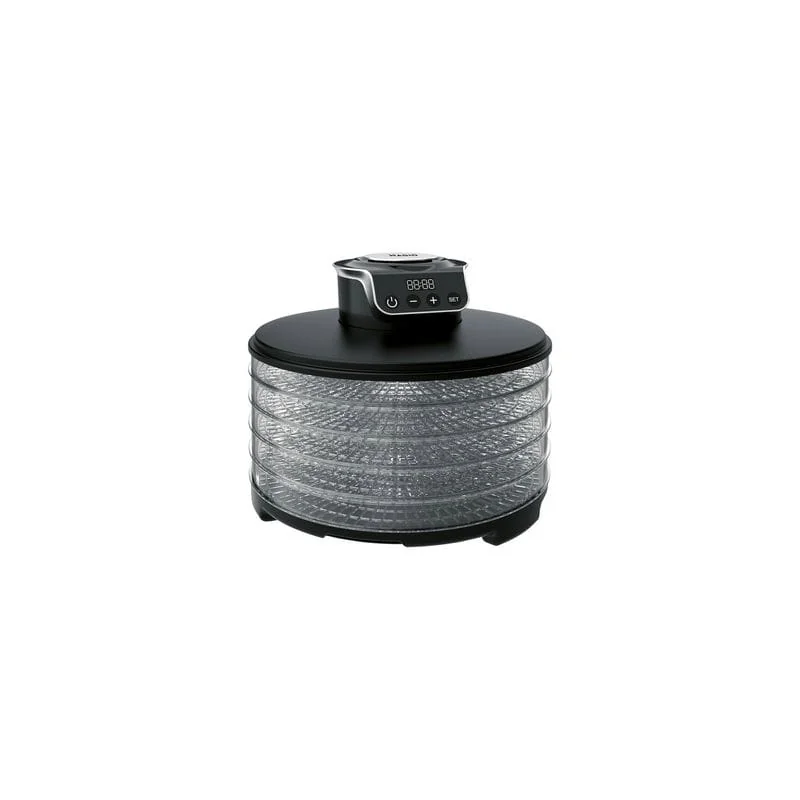Электросушилка MG-353 – легкий и удобный способ высушить овощи, фрукты, грибы, травы или мясо, а также максимально сберечь их полезные ингредиенты и витамины. Устройство имеет пять вместительных лотков из пластика. Управление механическое: на корпусе есть кнопка включения и ступенчатый регулятор температурных режимов на 8 позиций, позволяющий выбрать нагрев воздуха от 35 до 70° С. Сушка оборудована системой защиты от перегрева – при чрезмерном росте температуры нагревательный элемент автоматически отключается.