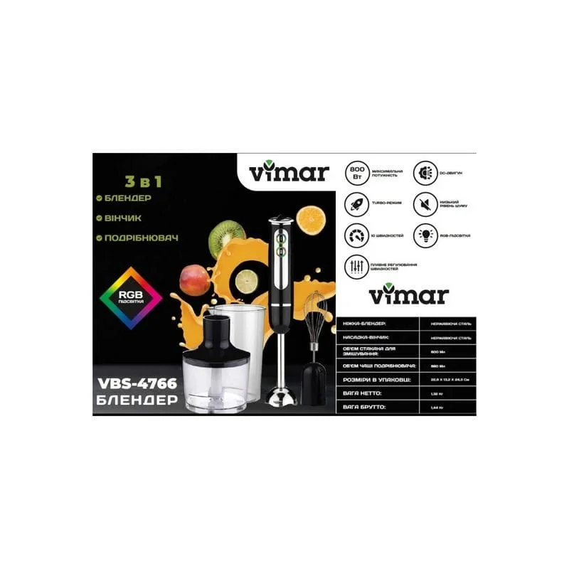 Универсальный погружной блендер Vimar VBS-4766B станет надежным помощником на кухне. Он не требует сложной процедуры составления и подготовки к работе. Достаньте блендер из шкафа, соедините его ножку с силовой стороной – и готовый прибор к работе. Блендер изготовлен из качественных износостойких материалов, его чаши и ножи можно мыть в посудомоечной машине. Компактные габариты будут являться преимуществом для организации хранения прибора. Vimar VBS-4766B работает с мощностью 800 Вт, чего вполне хватает для выполнения самых разных кухонных задач. Ножка блендера изготовлена из высококачественной нержавеющей стали и имеет специальную форму, исключающую разбрызгивание продуктов измельчения. Для расширения функциональных возможностей прибора укомплектовали его измельчителем объемом 860 мл. Измельчитель пригодится для обработки и измельчения овощей, творога, орехов, зелени. Измельчительная чаша изготовлена из прочного безопасного для здоровья пластика и пригодна для мытья в посудомоечной машине.