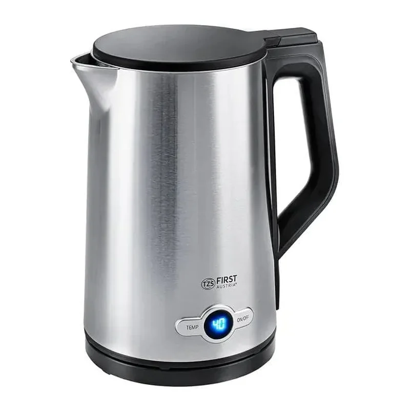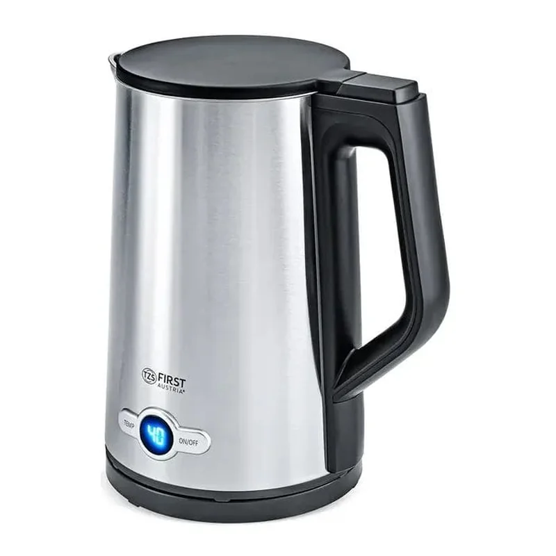 С современным чайником First FA-5407-5 вы сможете наслаждаться горячими напитками правильной температуры, идеально адаптированной по вкусу. Модель получила встроенный цифровой дисплей, на котором удобно отображается температура воды. Кроме того, чайник отличается удобным управлением, например, чтобы вскипятить воду, достаточно осуществить легкое нажатие на кнопку. Модель содержит в себе 1,7 литра воды, чего вполне достаточно для приготовления до 7 чашек любимого напитка. При этом автоматическая крышка позволит с лёгкостью не только наполнить чайник, но и очистить его. Невозможно обойти стороной и фильтр, предотвращающий образование накипи, положительно влияющий на вкус чая и кофе. Чайник имеет 7 температурных режимов: 40, 50, 60, 70, 80, 90, 100°. Таким образом вы сможете приготовить чай или кофе именно так, как вам нравится. После того, как вода достигнет нужной температуры, чайник можно удобно снять и поставить на место благодаря вращению на базе.