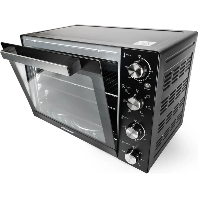 Отличные возможности Под стать внешности, не разочаровывают и возможности электропечки Holmer HEO-162CRL. Высокая мощность нагрева, выбор режимов работы, наличие гриля и конвекции. Все это атрибуты полногабаритной техники. Максимальная температура нагрева доходит до 250 градусов. Поэтому вряд ли вы столкнетесь с каким-то ограничениями в плане функциональности. Дверка духовки фиксируется в открытом положении. Но также есть промежуточная фиксация под углом в 20 градусов.