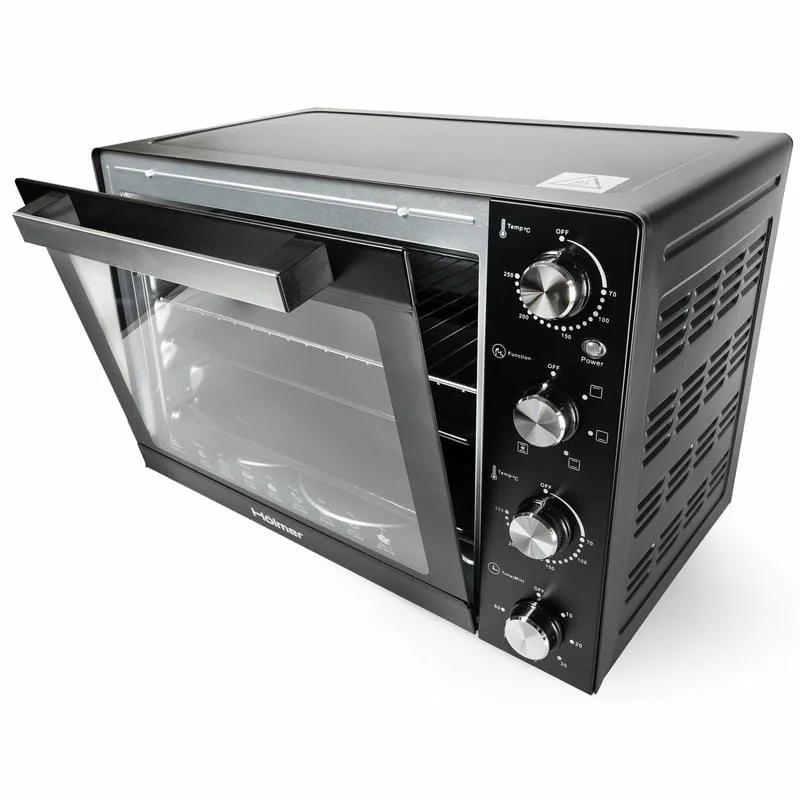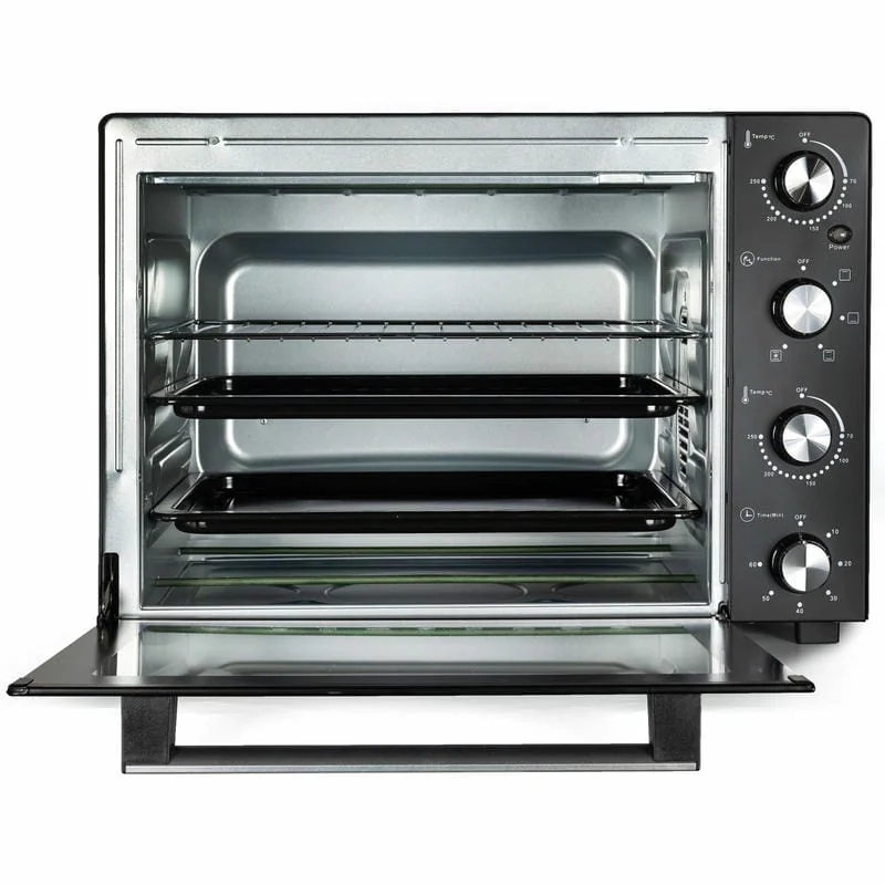 Корпус печи изготовлен из качественных материалов: сталь, пластик и стекло. Нагревательные элементы из нержавеющей стали обеспечивают надежность и долговечность устройства. Черный цвет корпуса придает элегантность и гармонично сочетается с любым кухонным интерьером. Внутренняя подсветка и световой индикатор работы помогут вам следить за процессом приготовления без необходимости открывать дверцу.