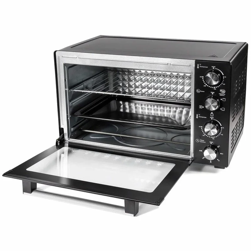 Печь оснащена антипригарным противнем, решеткой для гриля и съемной ручкой для удобного использования. Комплектация обеспечивает все необходимое для приготовления разнообразных блюд от хрустящих стейков до нежных выпечок.