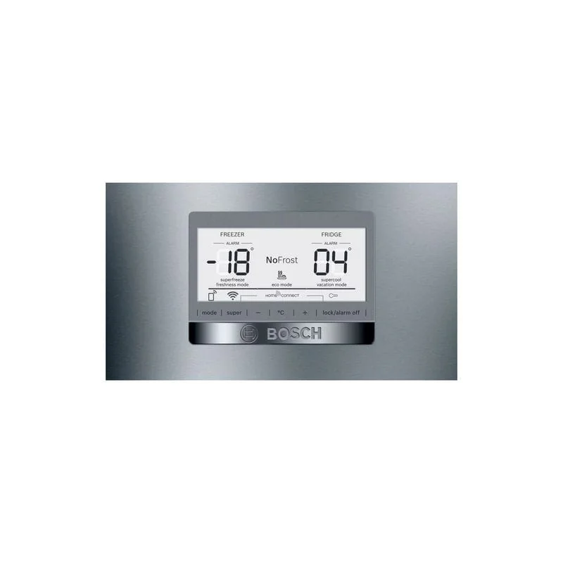 Жидкокристаллический дисплей на внешней стороне дверцы для выбора температуры в обеих камерах, специальных режимов работы прибора и функций. Функция быстрого охлаждения Super Cooling. Функция быстрой заморозки SuperFreezing с автоматическим отключением. Акустический сигнал и электронный индикатор от совершаемой дверцы. Специальные режимы работы прибора и специальные функции выбора на дисплее: режим "отпуск", режим "Экономный", блокировка прибора от детей.