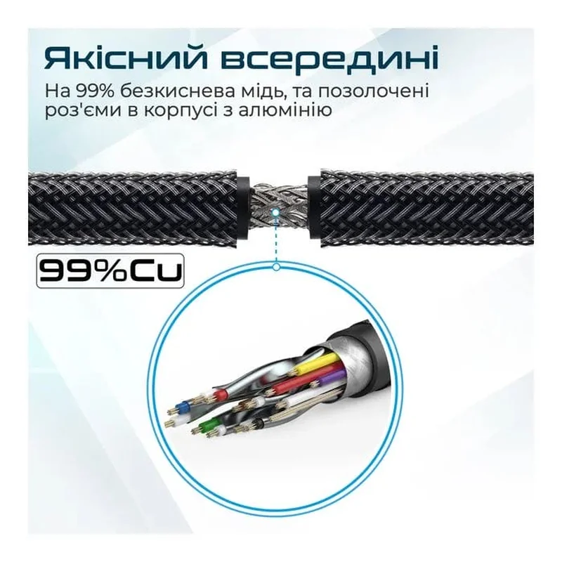- Качественный внутри: Кабель из 99% бескислородной меди, экранированный специальной фольгой и позолоченные разъемы в корпусе из алюминия.