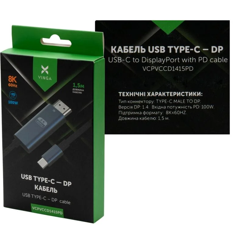 Відгуки 0 Кабель мультимедийный USB-C to DisplayPort 1.5m v1.4 8K60Hz PD 100W port Vinga (VCPVCCD1415PD)