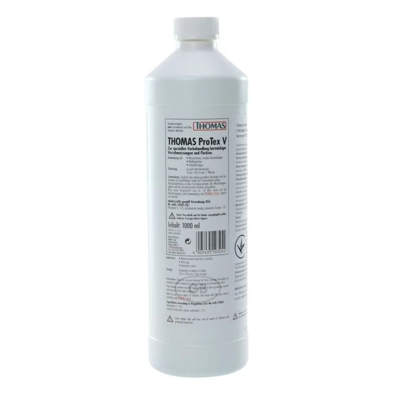 Моечный концентрат THOMAS ProTex V предназначен для чистки текстильных поверхностей и удаления стойких пятен. THOMAS ProTex V с легкостью справится с такими сложными загрязнениями как пятна от кофе, вина, фруктовых соков и т.д. Чтобы вывести сложное, а тем более устаревшее пятно, сначала нанесите раствор THOMAS ProTex V на загрязненный участок поверхности и оставьте на 10 минут. Принцип такой же, как у замачивания перед стиркой. Через 10 минут после этого проведите обычную влажную чистку, добавив THOMAS ProTex V (или THOMAS ProTex) в бачок с чистой водой. От пятен не останется и следа!