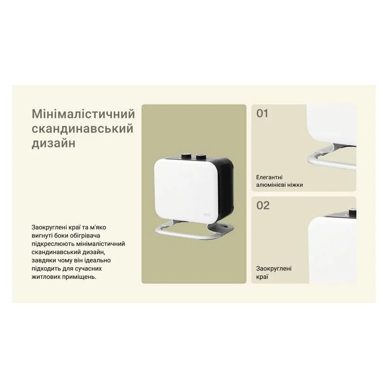 Mill CUS1800MECWA — це невеликий, елегантний тепловентилятор, який вигідно поєднує в собі ефективність і стиль. Заокруглені краї та плавні форми створюють мінімалістичний скандинавський дизайн, і обігрівач легко вписується в сучасний інтер'єр будь-якого будинку.