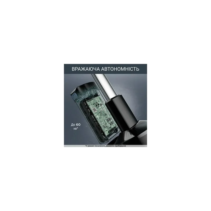6-элементная литий-ионная батарея 21,6 В обеспечивает до 60 минут глубокой очистки* и до 20 минут действие 2 в 1: мощное всасывание пыли и качественная влажная уборка**( *в режиме усиленной влажной уборки, **в режиме 2 в 1).