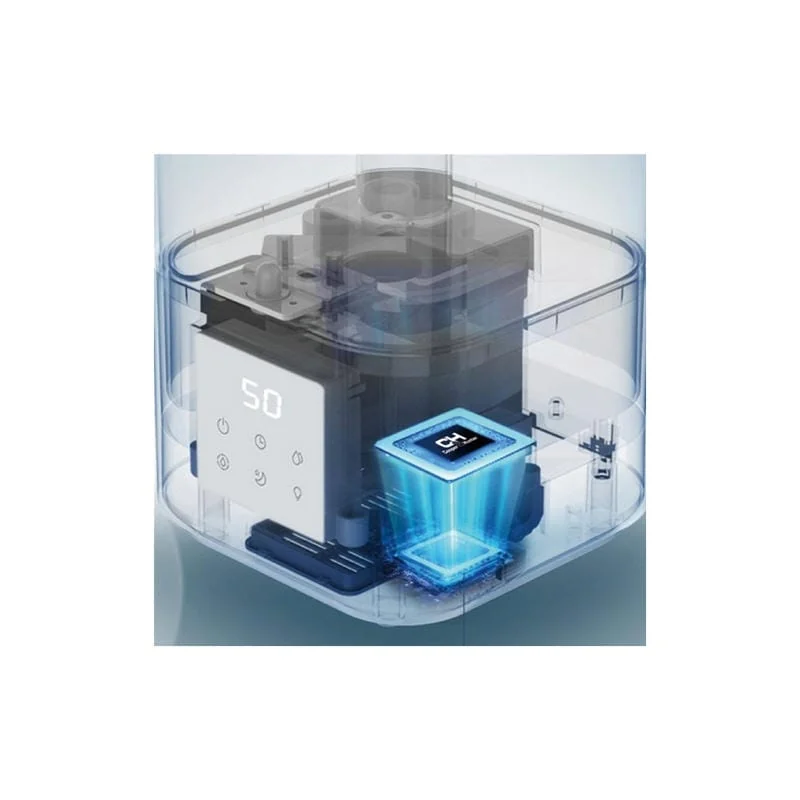 Нежно белый цвет увлажнителя с прозрачной верхней частью светящейся небесно синим цветом дополнит даже самый элегантный интерьер.