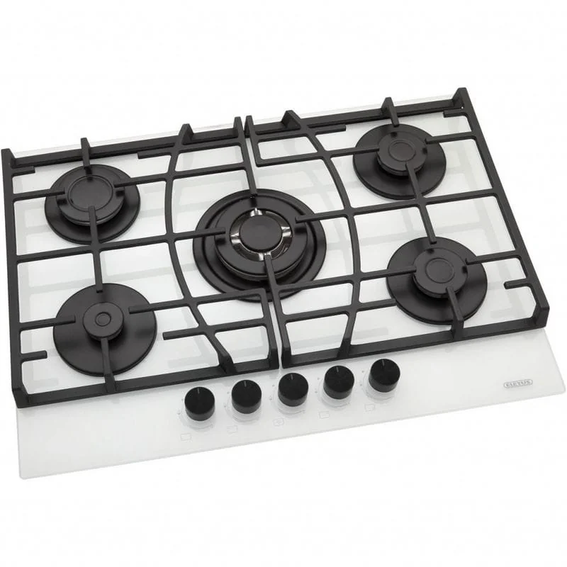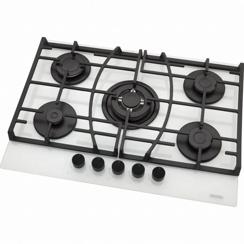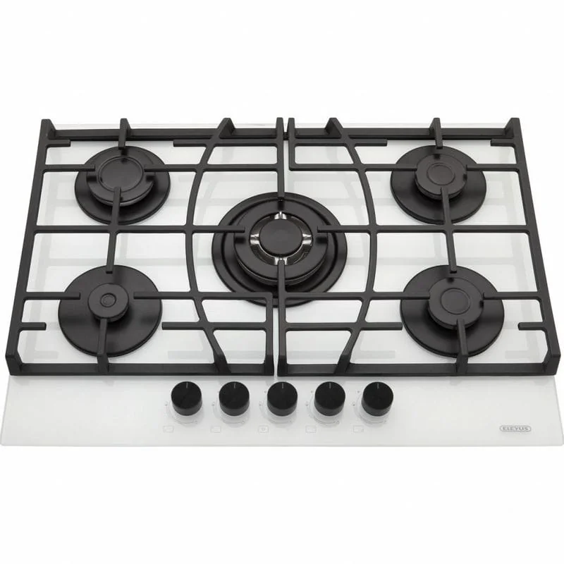 Газовая независимая варочная поверхность, закаленное стекло, 5 конфорок, двухконтурная горелка, электроподжиг автоматический, газ-контроль, поворотные переключатели на передней части панели, чугунные решетки